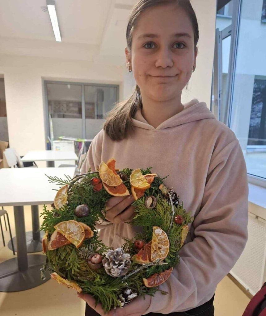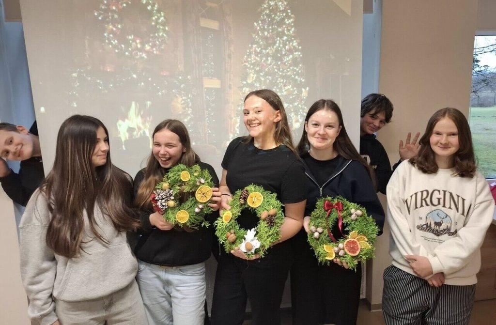 Iniciatyvoje aktyviai dalyvavo 5–IIIG klasių mokiniai, kurie su entuziazmu ėmėsi kūrybinio darbo. Kiekviena klasė gamino savitą kalėdinį vainiką: vieni rinkosi tradicinius eglišakius ir raudonus kaspinus, kiti – modernius, iš antrinių žaliavų ar rankdarbių technikų sukurtus sprendimus. Šie vainikai tapo ne tik puošmena, bet ir simboliniu šventinės nuotaikos ženklu, primenančiu apie bendrystę ir kūrybiškumą.