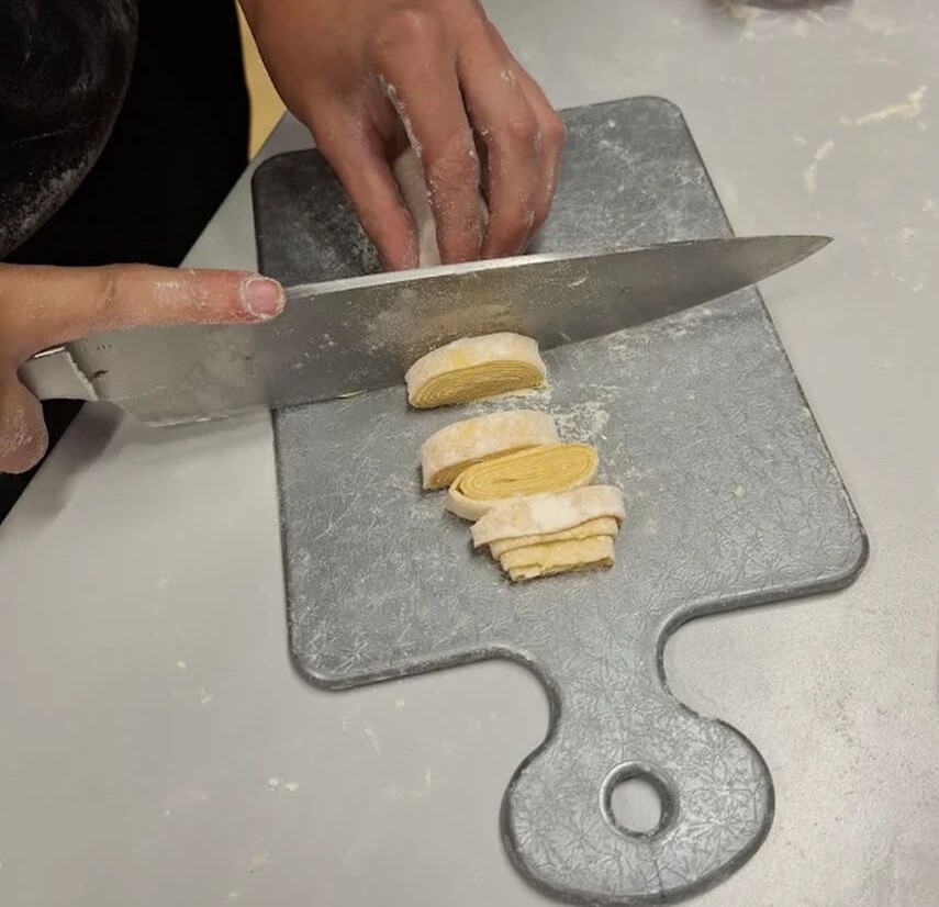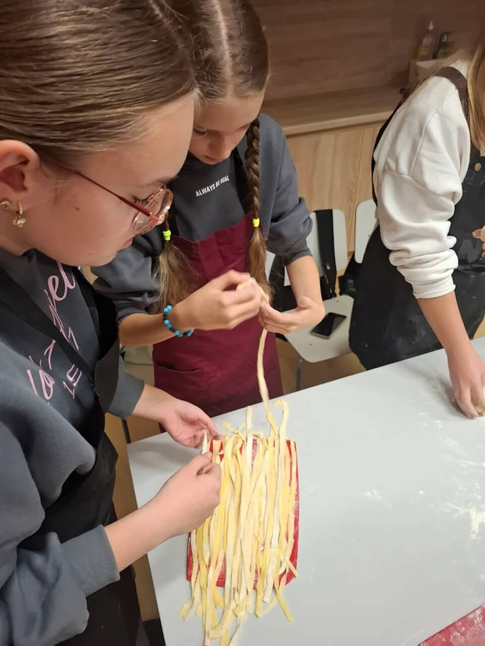 Kiekviena grupė pasiruošė savo vietą, minkė tešlą, ją kočiojo ir formavo įvairių formų makaronus, jausdamiesi lyg tikri italų virtuvės meistrai. Baigę gaminti, šeštokai ragavo savo pagamintus makaronus, aptarė jų skonį ir pasidžiaugė puikiai pavykusiu darbu.