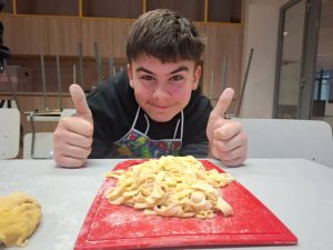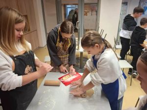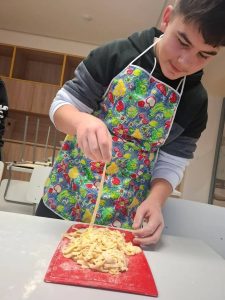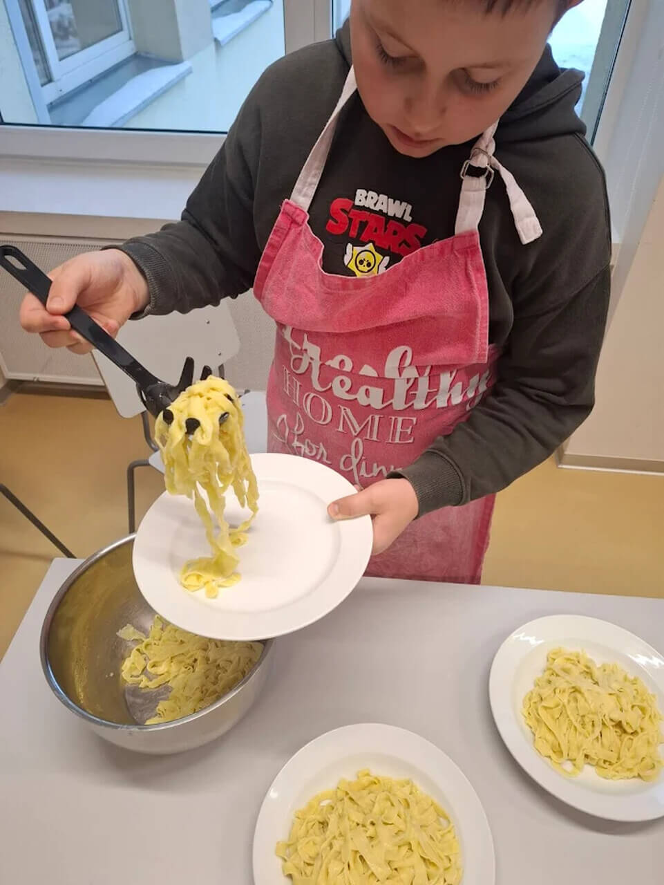 Lapkričio 26-ąją, snieguotą žiemos dieną, šeštos klasės mokiniai per technologijų pamoką gamino naminius makaronus. Pamokos pradžioje jie susipažino su gamybos procesu, reikalingais produktais ir darbo vietos paruošimu. Išklausę mokytojo patarimų, mokiniai entuziastingai pradėjo darbą.