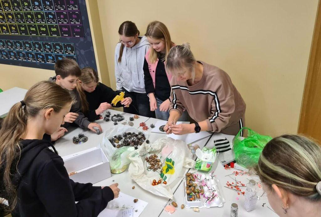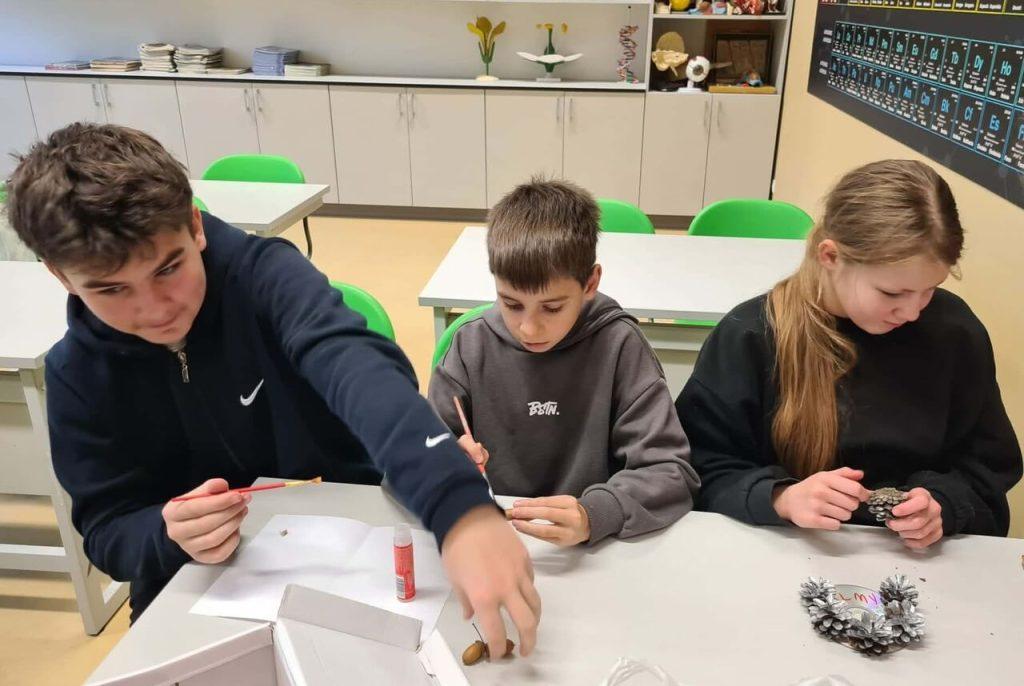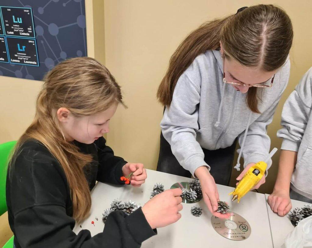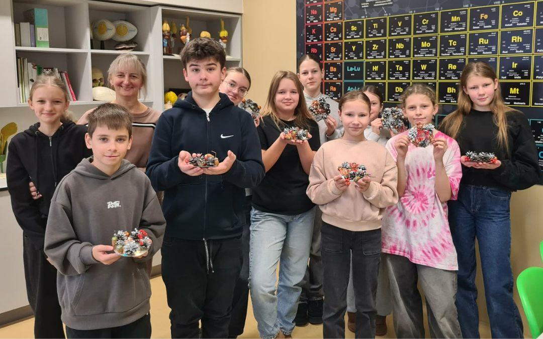 Uczniowie klasy 6a wraz z wychowawczynią Alicją Karpowicz podczas lekcji wychowawczej wspólnie przygotowywali ozdoby świąteczne. Zajęciom towarzyszyła niezwykła atmosfera zbliżających się świąt, rozbrzmiewały kolędy oraz pastorałki. Lekcja była wyjątkowa, gdyż poprowadziła ją mama Aurelii. Pani Danuta pokazała, jak wykorzystać do dekoracji materiały dostępne w domu oraz surowce wtórne. Przekonała również, że to dobra okazja, aby wyjść na spacer do lasu, aby nazbierać szyszek, żołędzi, orzechów, suchych gałązek. Pod pilnym okiem pani Danuty uczniowie wykonali ozdoby świąteczne, którymi udekorują swój dom.