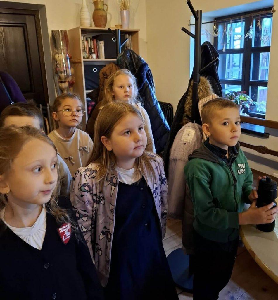 Następnie dzieci obejrzały film edukacyjny „Droga ziarenka do pajączka ze słomy”, dzięki któremu mogły poznać cały proces powstawania tradycyjnych ozdób ze słomy. Po projekcji uczniowie zwiedzili piękną wystawę prac „Pajączki ze słomy”, która wzbudziła w nich duży zachwyt i ciekawość.