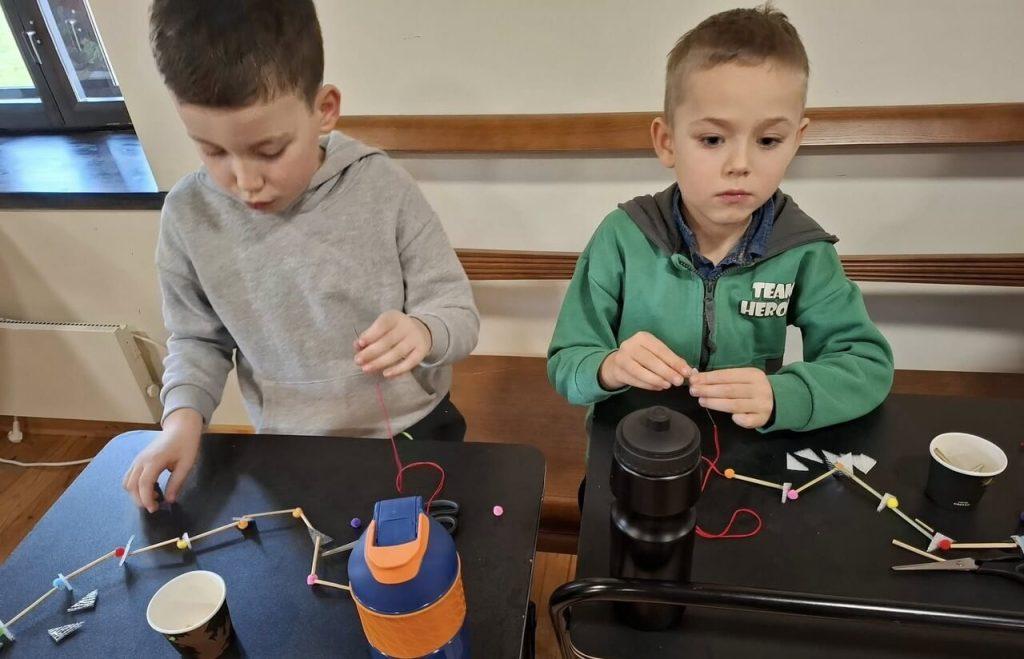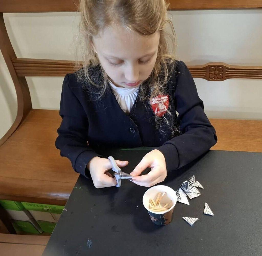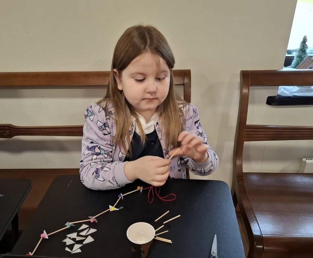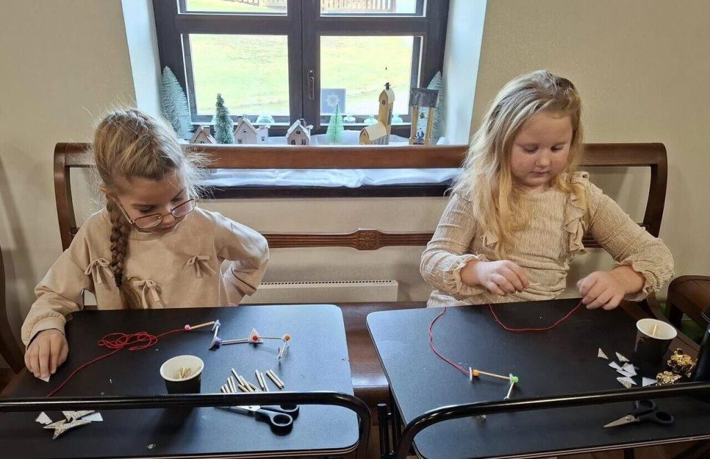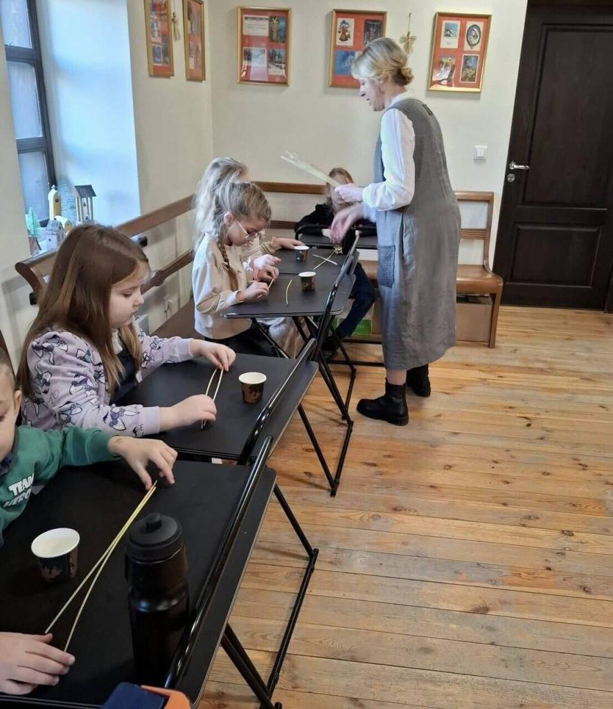 Po części wprowadzającej przyszedł czas na działanie praktyczne. Dzieci z ogromnym zapałem przystąpiły do własnoręcznego wykonywania słomianych ozdób. Pod czujną opieką metodyk muzeum uczniowie stworzyli wspaniałe słomiane łańcuszki, wykazując się kreatywnością i dużą starannością.