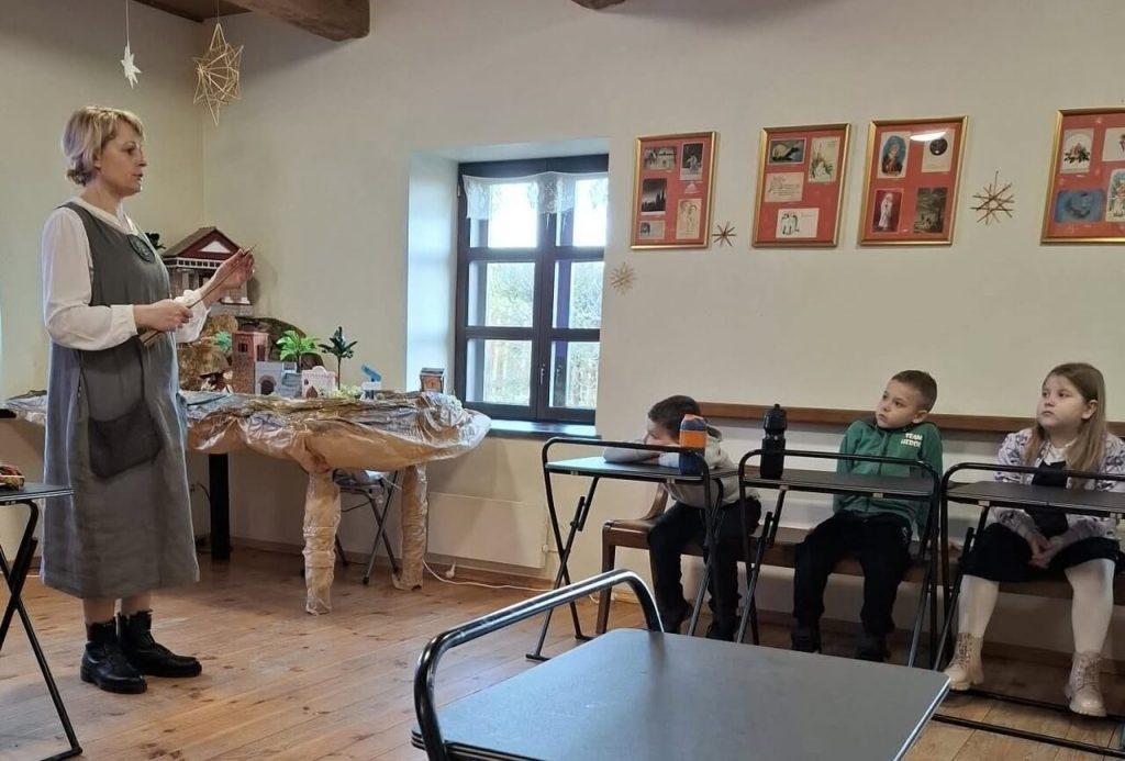 10 grudnia uczniowie klasy 1a naszego gimnazjum wzięli udział w zajęciach edukacyjnych w muzeum W. Syrokomli w Borejkowszczyźnie pt. „Zabawki ze słomy”. Na początku spotkania wspólnie przypomnieliśmy sobie, jakie święta nadchodzą oraz w jaki sposób przygotowujemy się do ich obchodów.