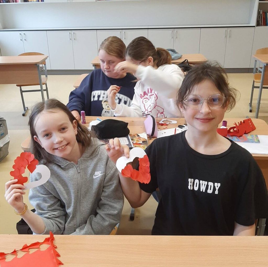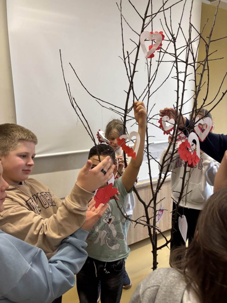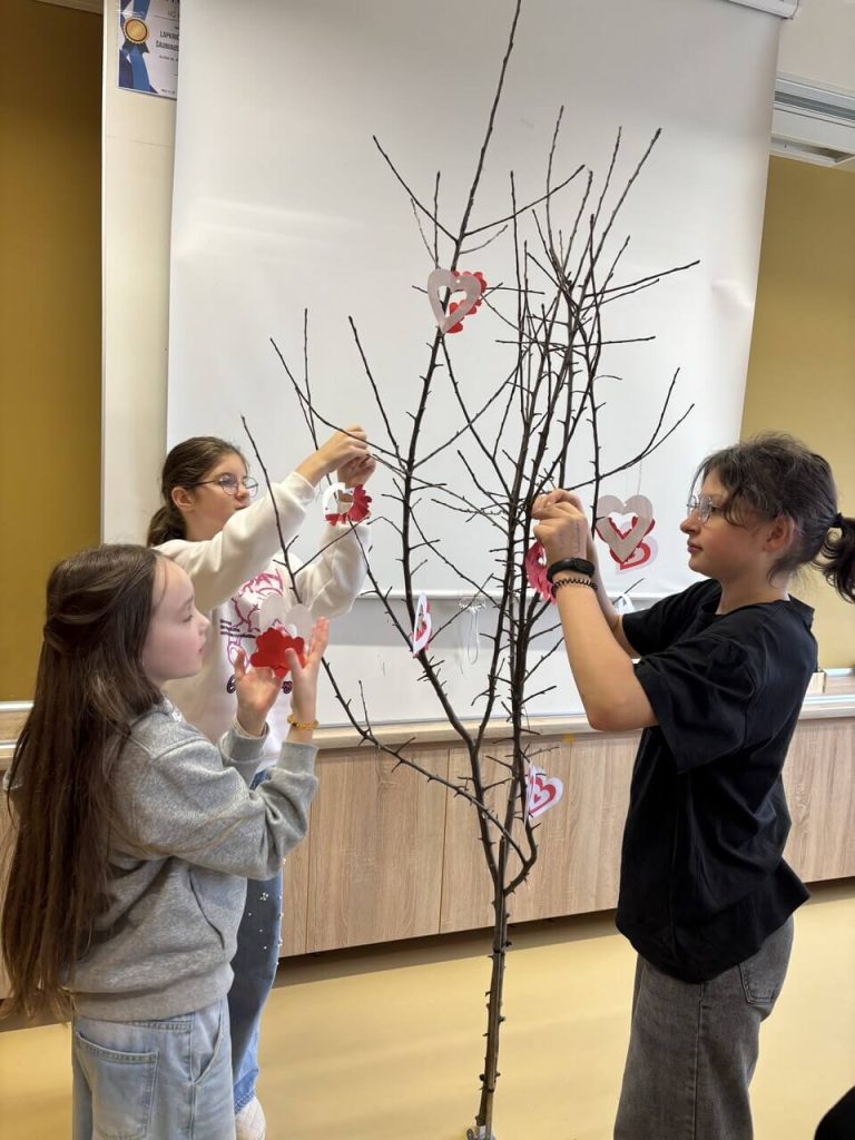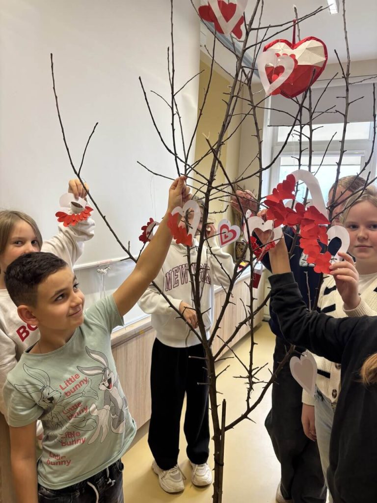 W ramach Tygodnia Jezyka Polskiego 12 listopada w naszej szkole odbyła się wyjątkowa inicjatywa pod hasłem „Serduszko dla Polski”, w której udział wzięli uczniowie klas 5–6. Dzieci z ogromnym zaangażowaniem stworzyły drzewko z życzeniami dla Polski. Na jego gałązkach zawisły biało-czerwone serduszka z najpiękniejszymi słowami: wolność, miłość pokój, radość, dobrobyt.