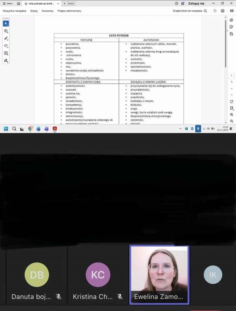 Ważnym elementem szkolenia były również konsultacje on-line, podczas których nauczycielki mogły zadawać pytania, dzielić się własnymi doświadczeniami oraz omawiać konkretne sytuacje z codziennej pracy szkolnej. Prowadząca E. Zamojtuk udzielała praktycznych wskazówek i podpowiadała, jak wprowadzać omawiane metody w pracy z uczniami edukacji wczesnoszkolnej.