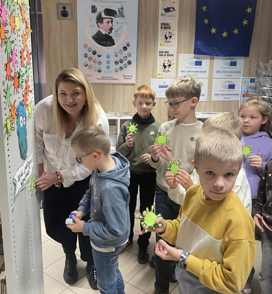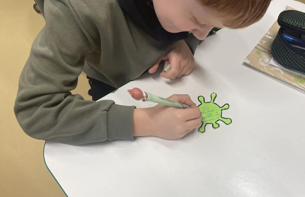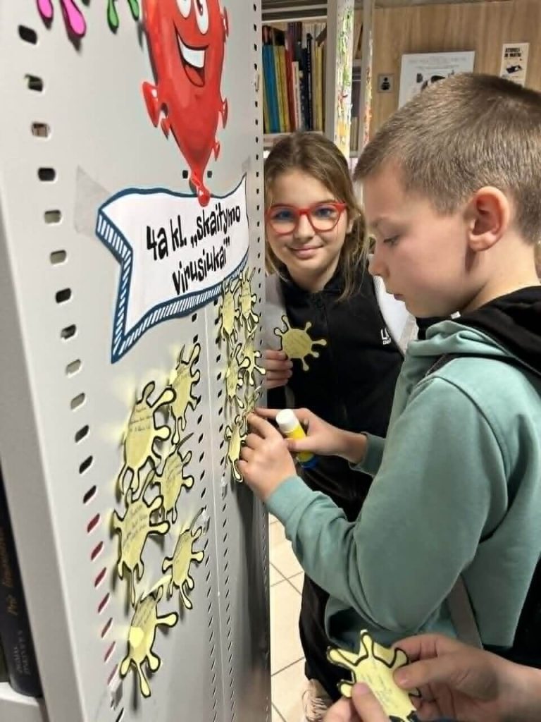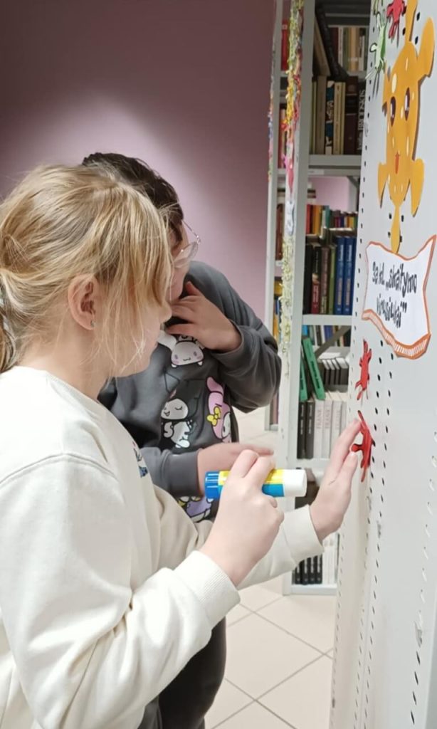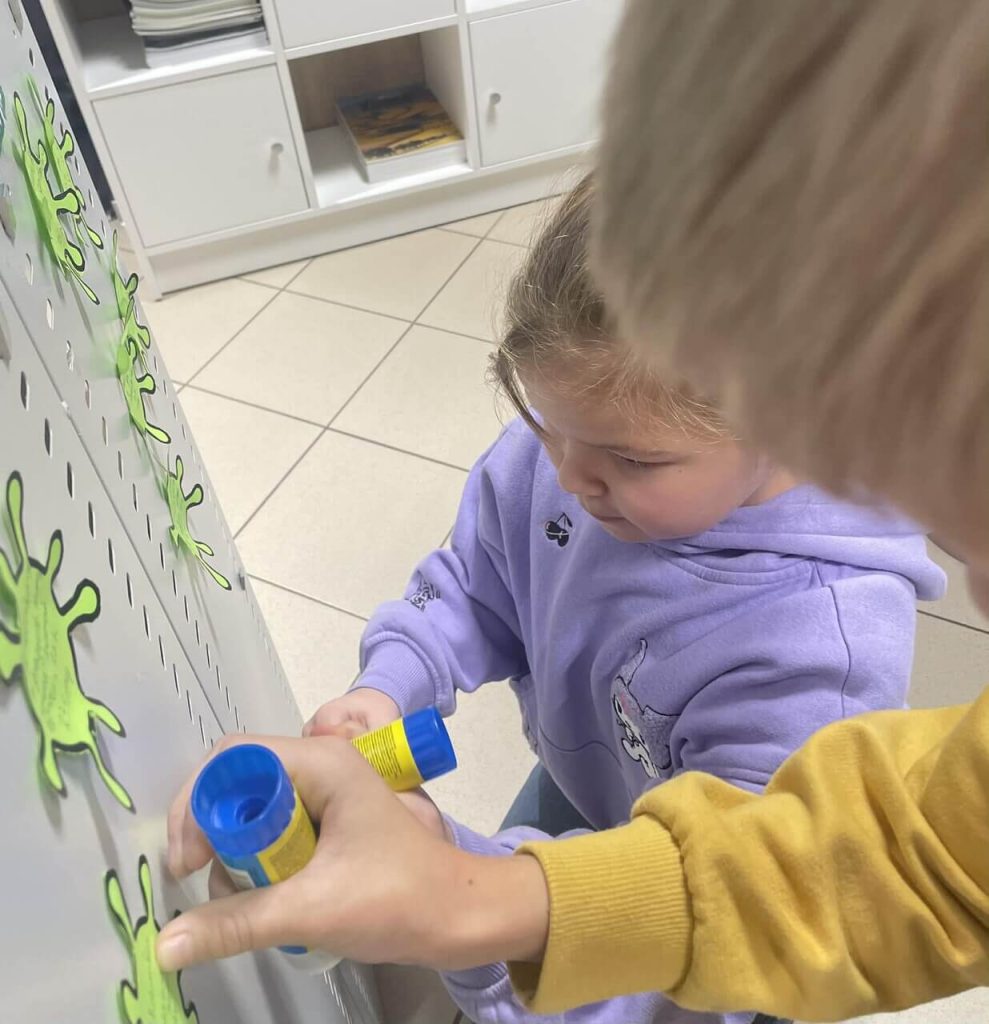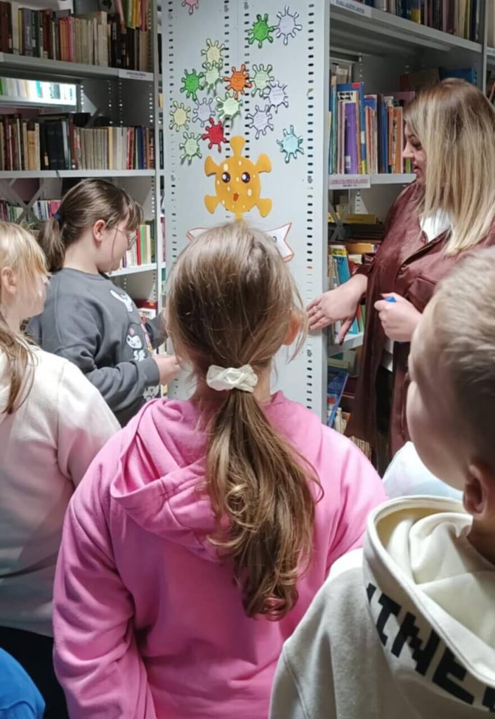 Pierwszym etapem było podpisanie wirusików – symbolicznych karteczek, które każdy uczeń wypełnił swoim imieniem. Następnie dzieci z dumą przykleiły je na specjalnie przygotowanej planszy, tworząc kolorową i motywującą mapę czytelniczych postępów. Plansza ta będzie towarzyszyć im przez cały czas trwania projektu, zachęcając do dalszego sięgania po książki.