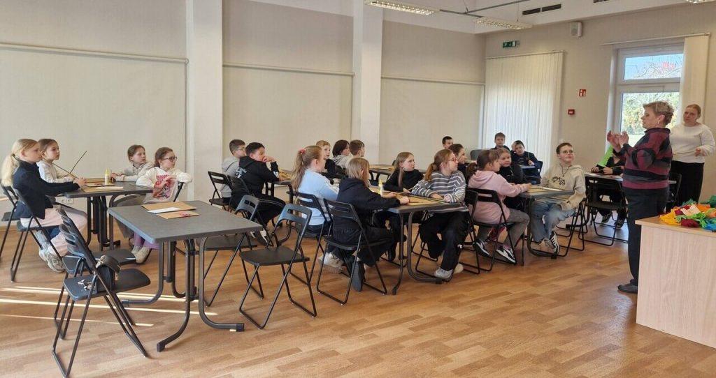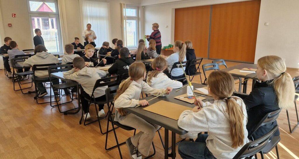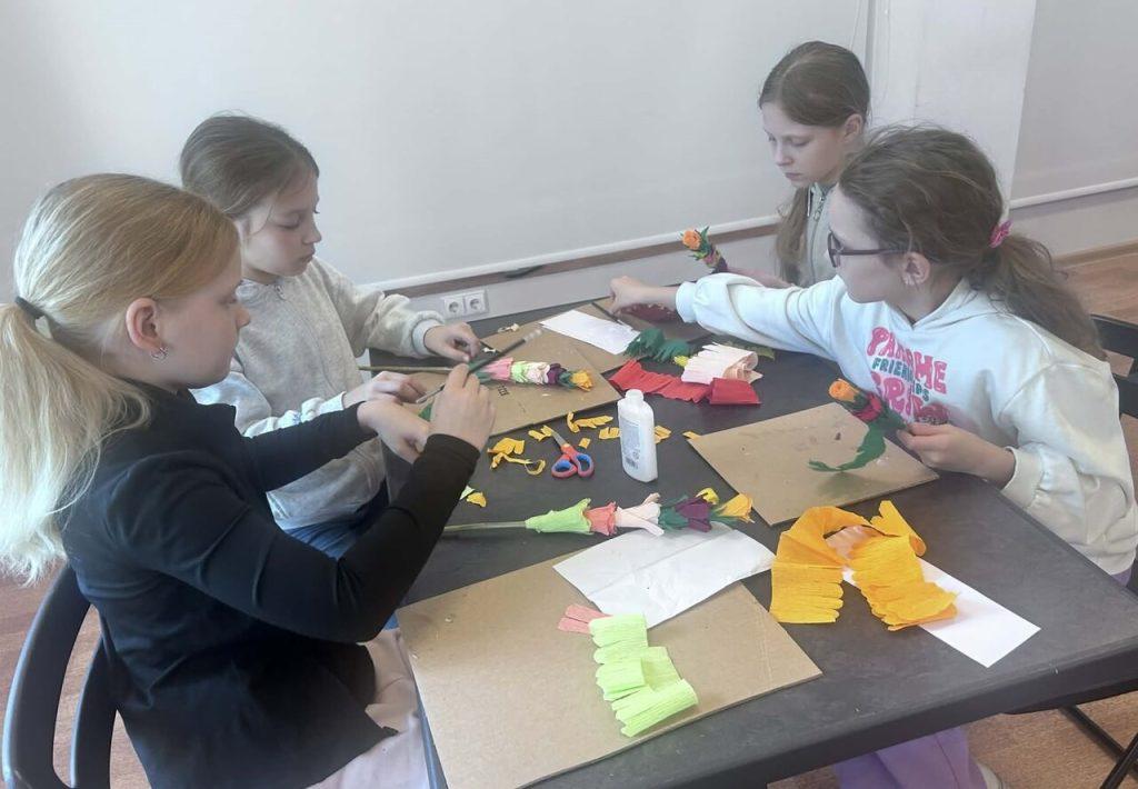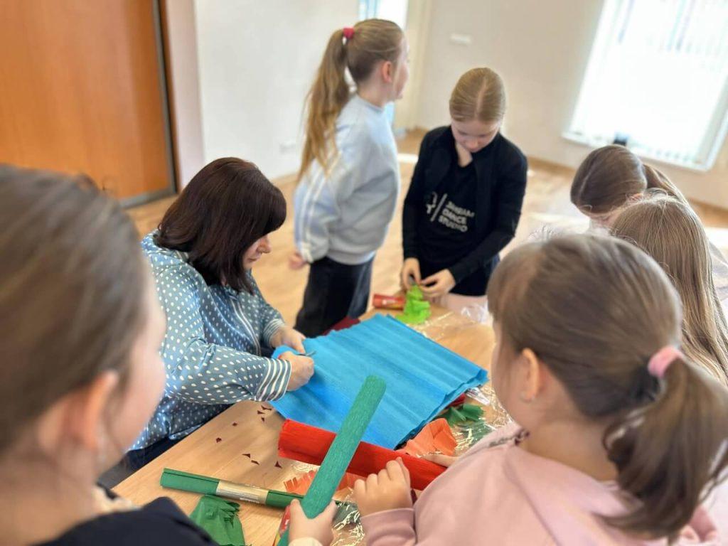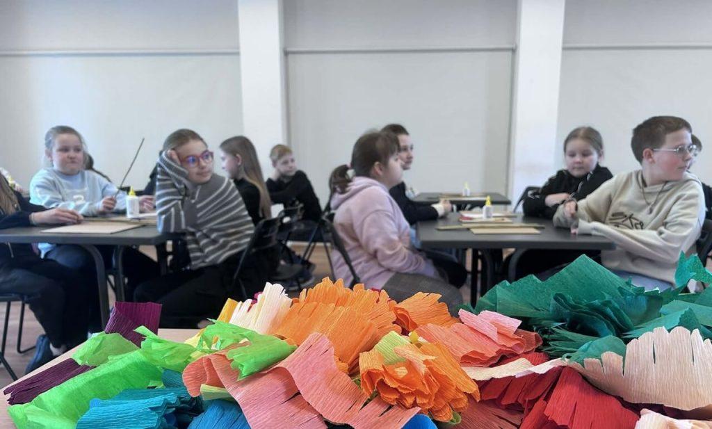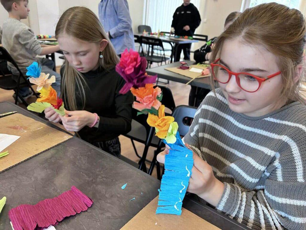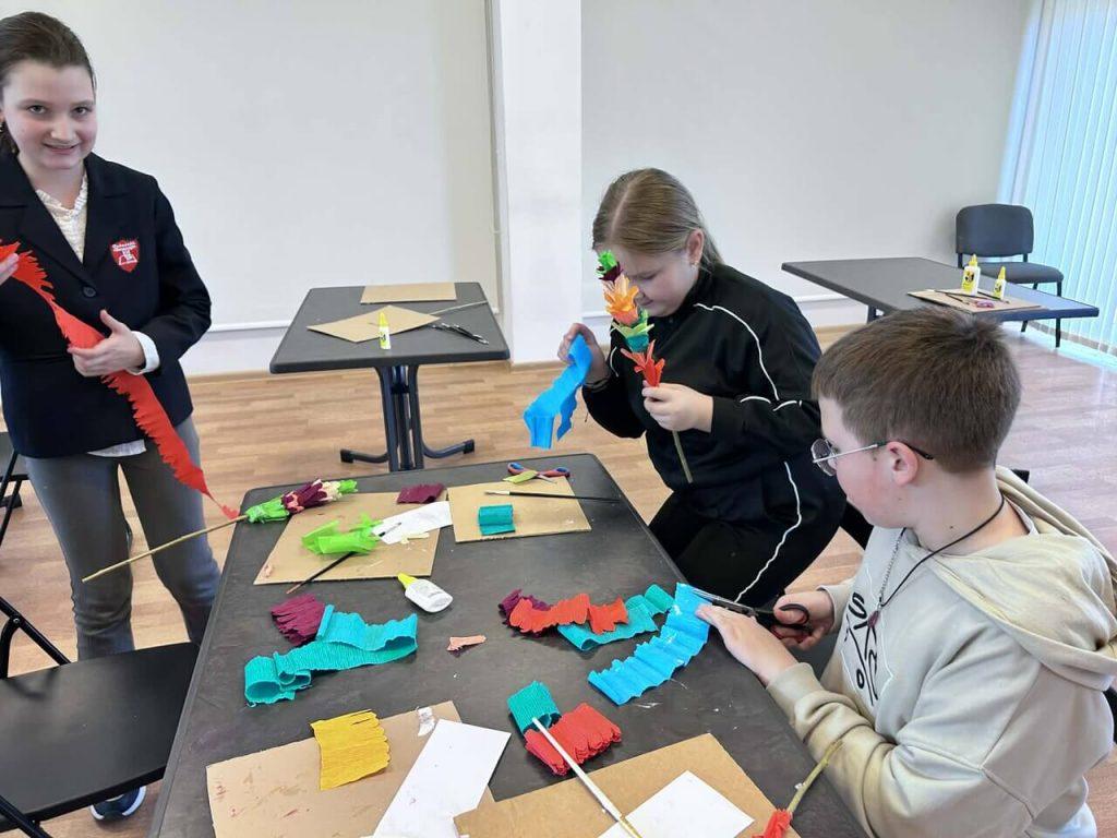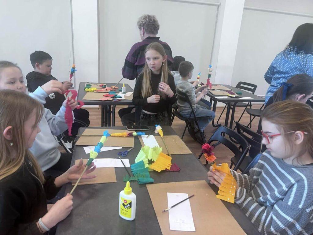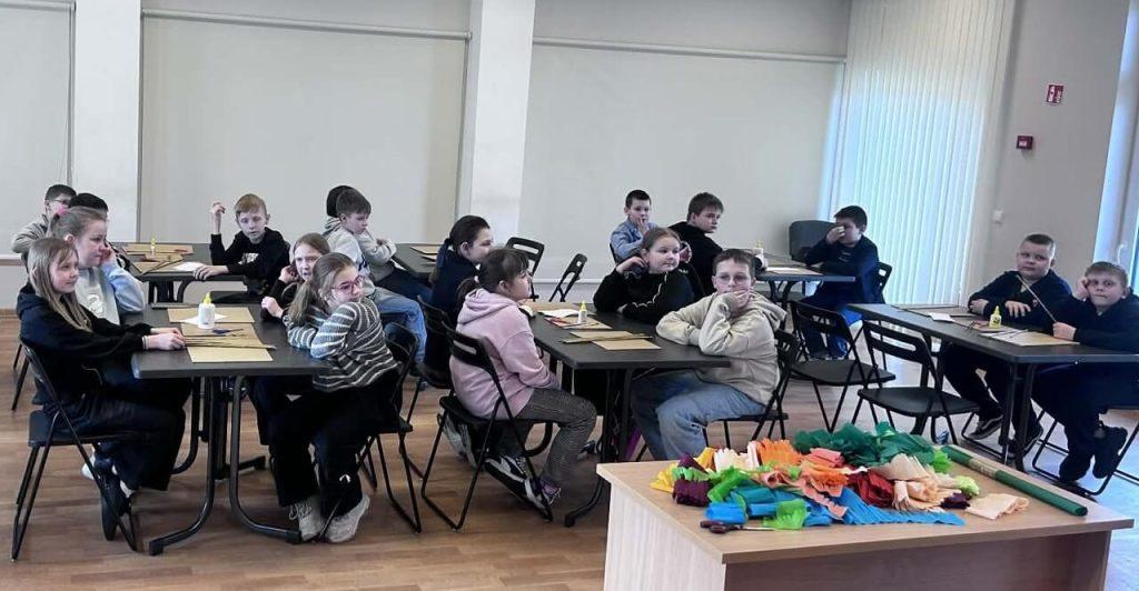 W sali domu kultury, wypełnionej kolorowym papierem i radosnym śmiechem uczniów, odbyły się zajęcia edukacyjne pod hasłem „Palmy z papierowych kwiatów”, w których aktywnie uczestniczyli uczniowie klas początkowych gimnazjum. Spotkanie przebiegło w radosnej i twórczej atmosferze.